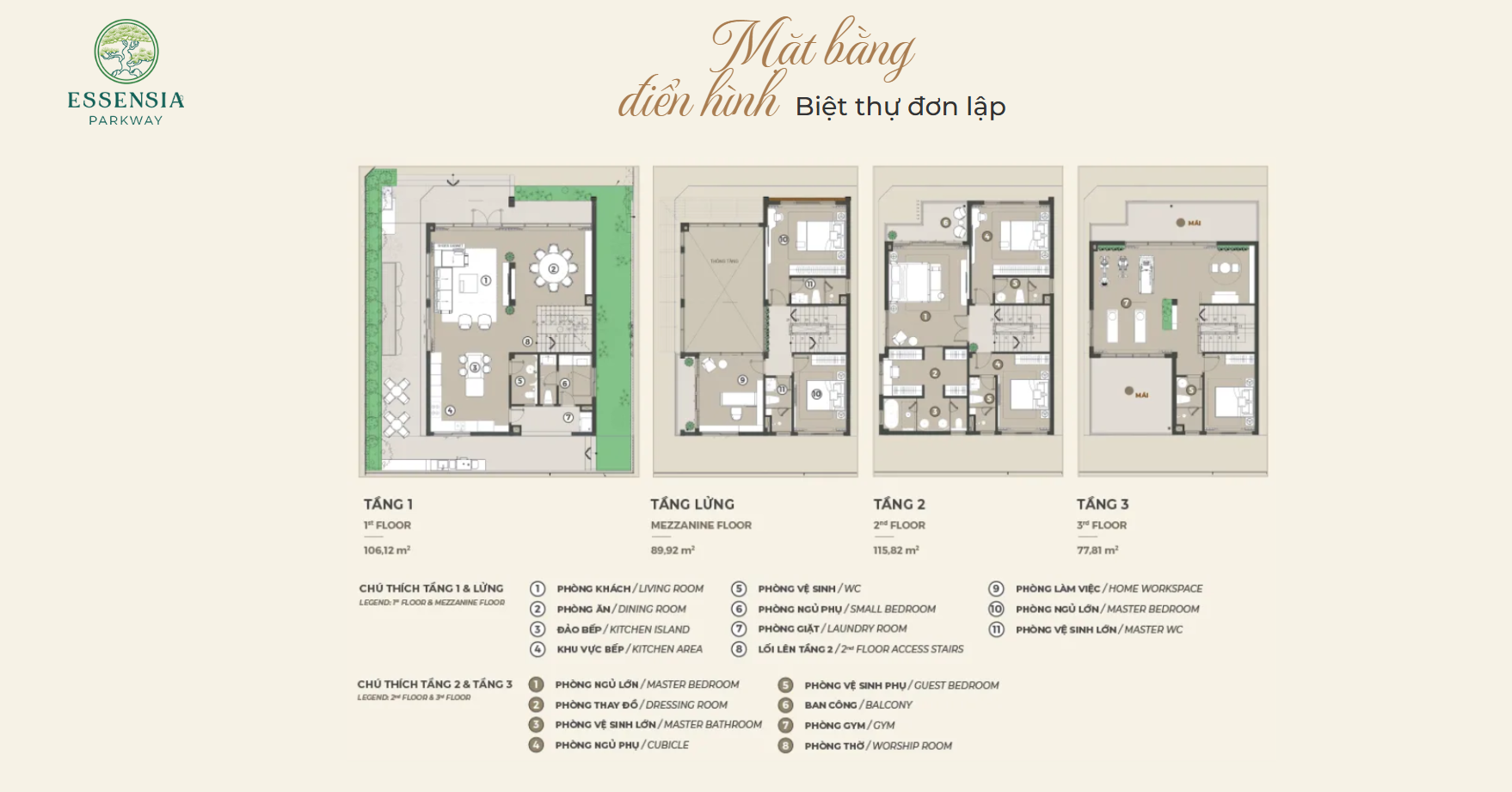 Biệt thự đơn lập: Lấy cảm hứng từ biểu tượng Tsuru – cánh hạc thanh thoát, mỗi căn biệt thự đơn lập Essensia Parkway là tuyên ngôn của sự thanh tịnh, trường tồn và may mắn. Nội thất được chăm chút kỹ lưỡng, kết hợp màu sắc hài hòa, chất liệu tự nhiên và những đường nét tinh tế, chắt lọc. Không gian sống mở ra sự hòa hợp tuyệt đối giữa con người và thiên nhiên, cũng như khát khao vươn tới những điều tốt đẹp và trường cửu.