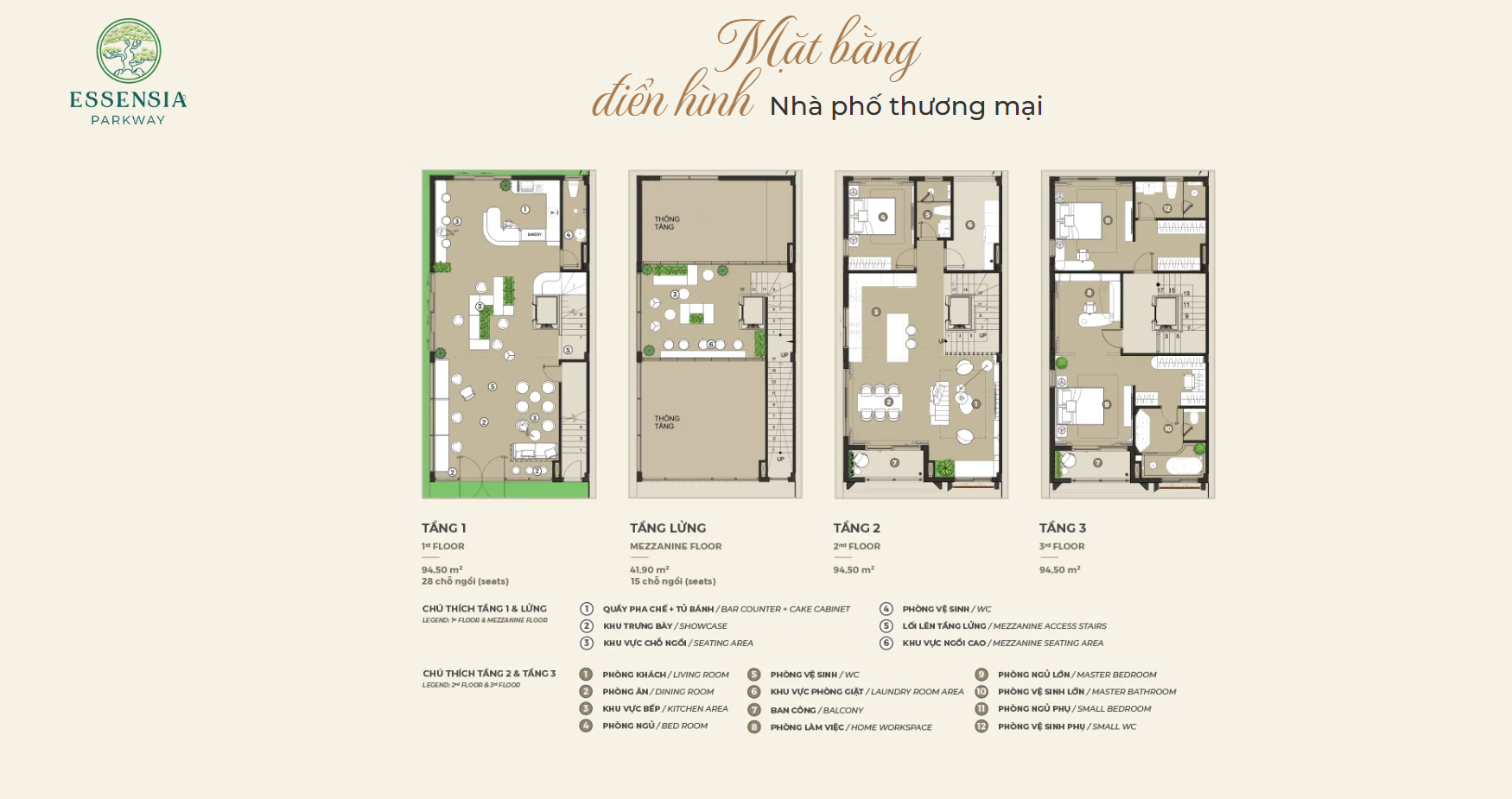 Nhà phố thương mại: Lấy cảm hứng từ “Sweety Bee” – những chú ong năng động và chăm chỉ, những căn nhà phố thương mại Essensia Parkway sở hữu thiết kế mở linh hoạt, nội thất sang trọng, vừa mang lại giá trị giao thương náo nhiệt, vừa đong đầy xúc cảm để là nhà.