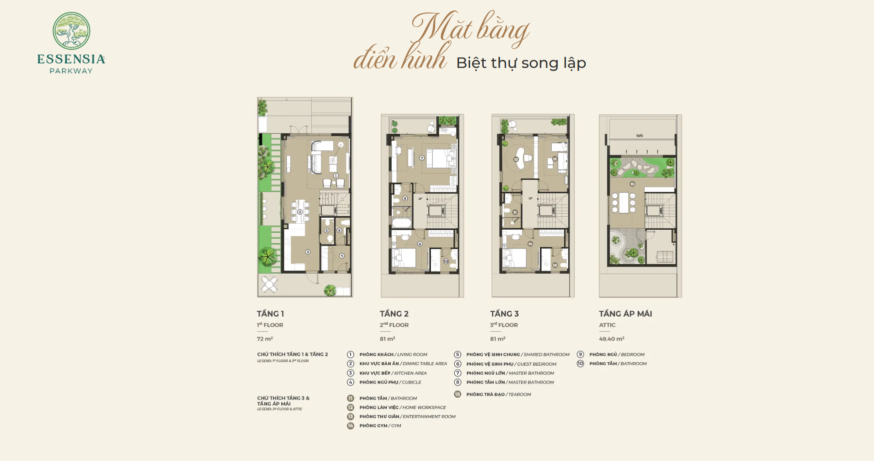 Biệt thự song lập: Lấy cảm hứng từ “The Nest”, mỗi căn biệt thự Essensia Parkway là nơi con người và thiên nhiên hòa làm một. Nội thất mang phong cách Nhật Bản, kỹ càng trong từng chi tiết, phác lên không khí ấm cúng đầy tinh tế của một chiếc tổ ấm gắn kết gia đình.